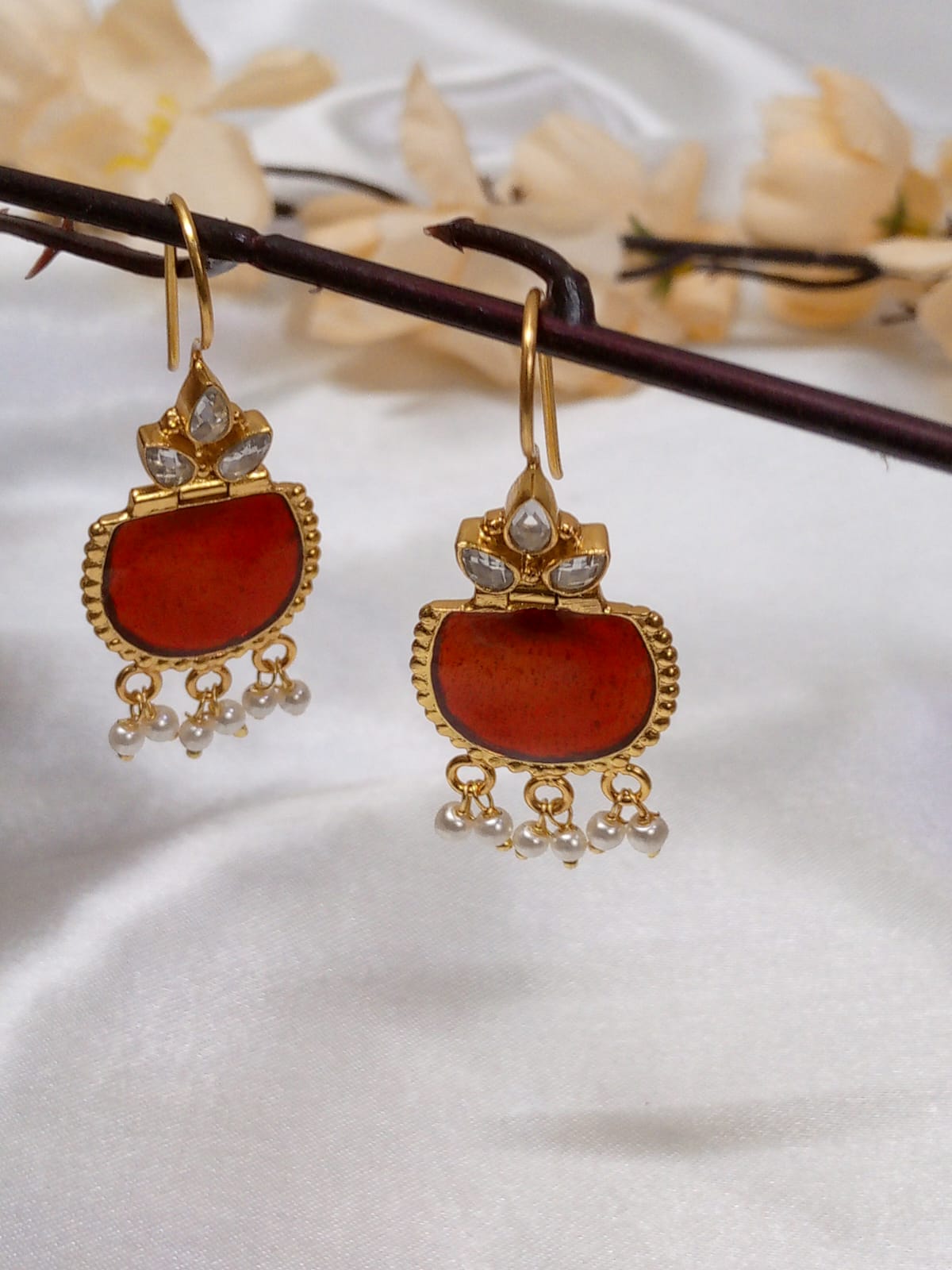 Crafted for the modern woman, our Agni earrings are a stunning combination of elegance and tradition. The 925 silver hoops are delicately adorned with gold plating, zircon, pearls, and red meenakari, creating a captivating and timeless look.
