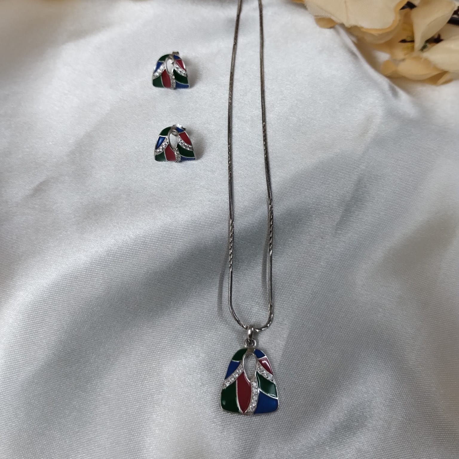 Elevate your accessorizing game with this stunning Bohemian-themed pendant set. Featuring captivating shades of red, blue and green, this set adds a whimsical touch of color to any outfit.