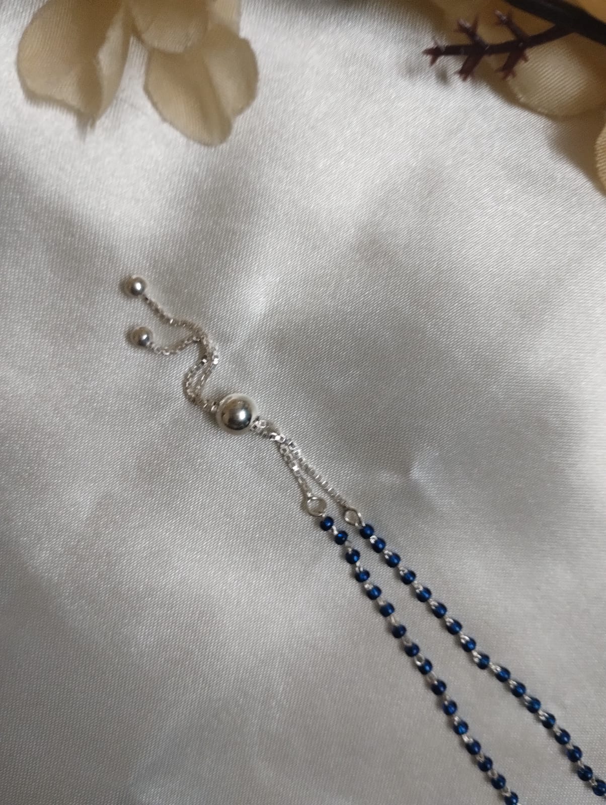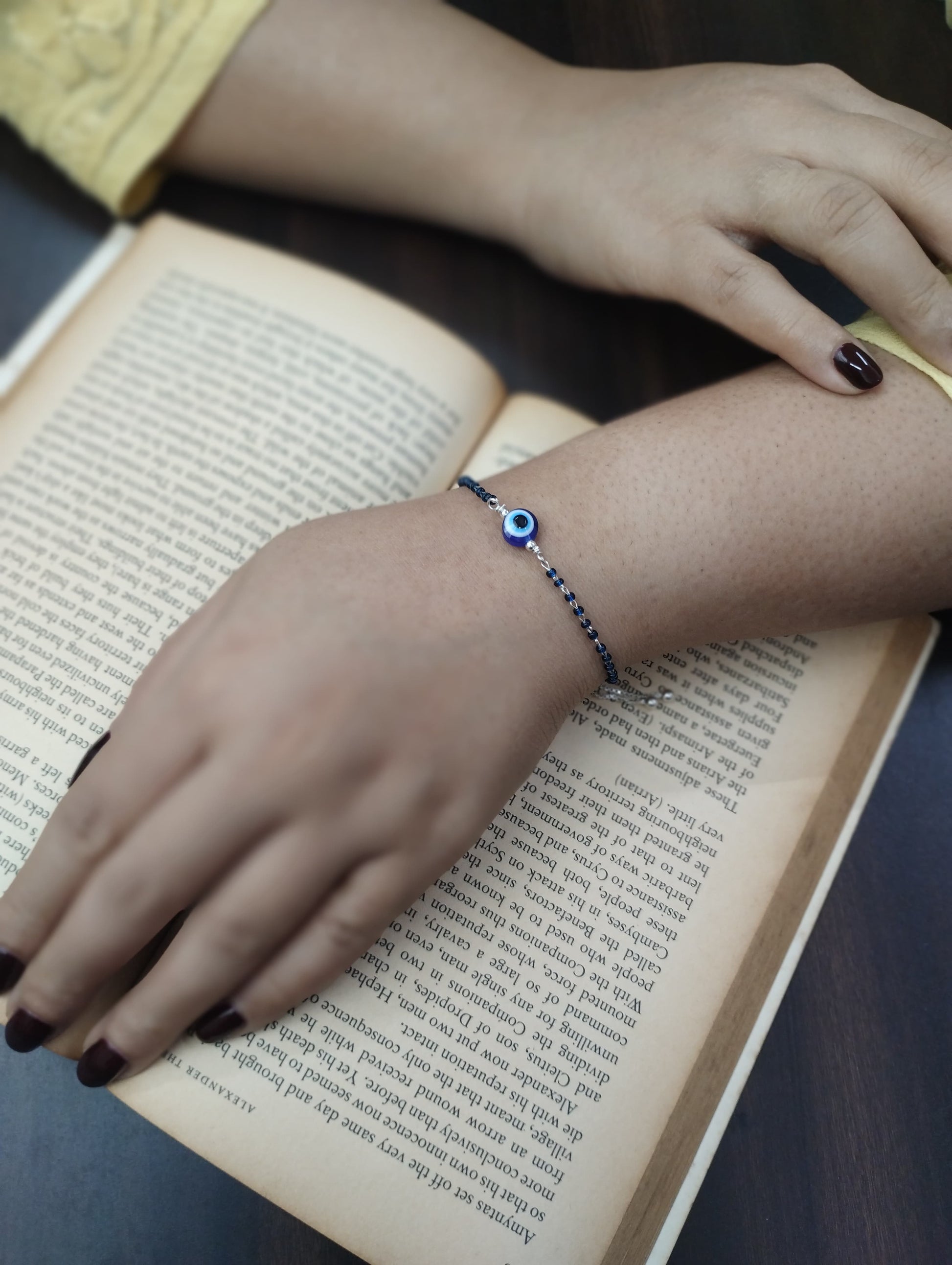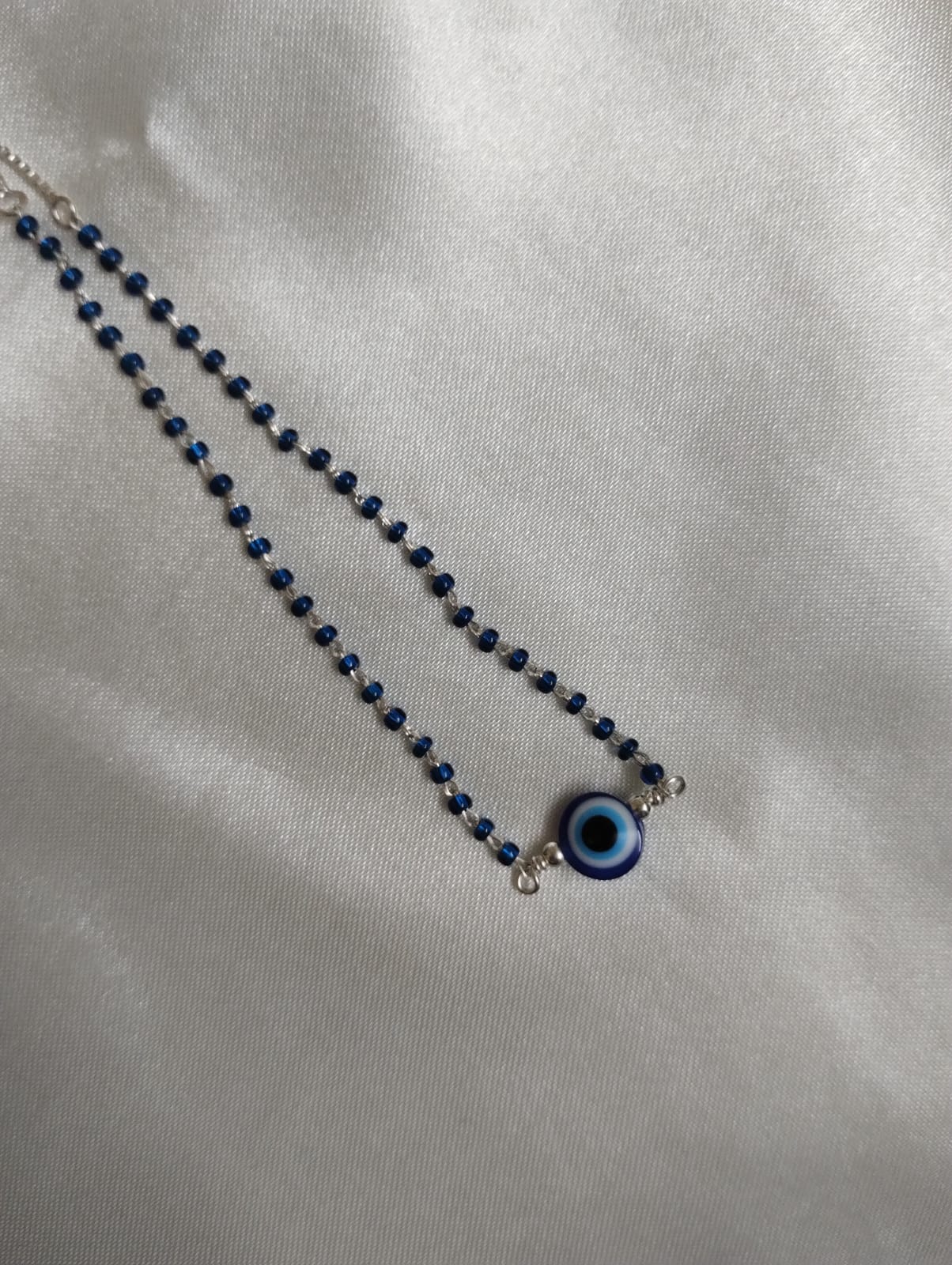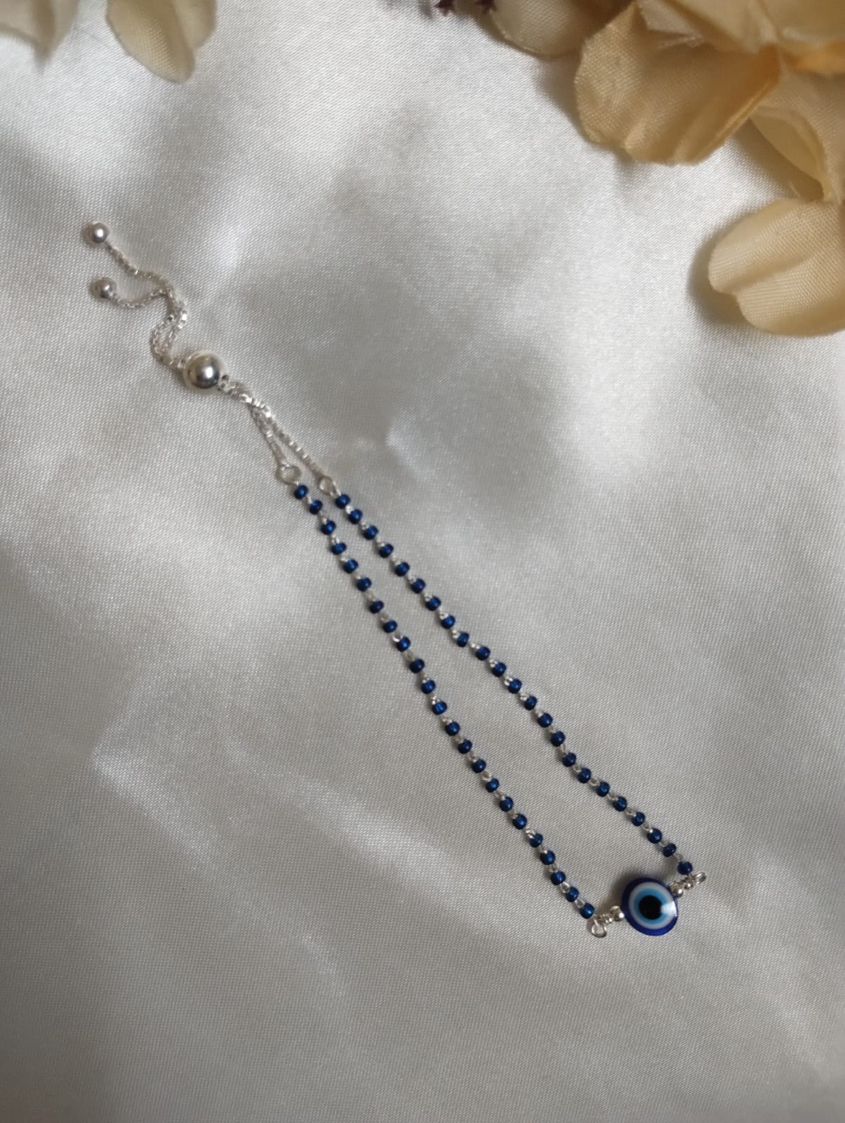 This adjustable evil eye bracelet is the perfect addition to your jewelry collection. Made in silver and adorned with deep blue beads, this bracelet has a simple yet elegant design.
