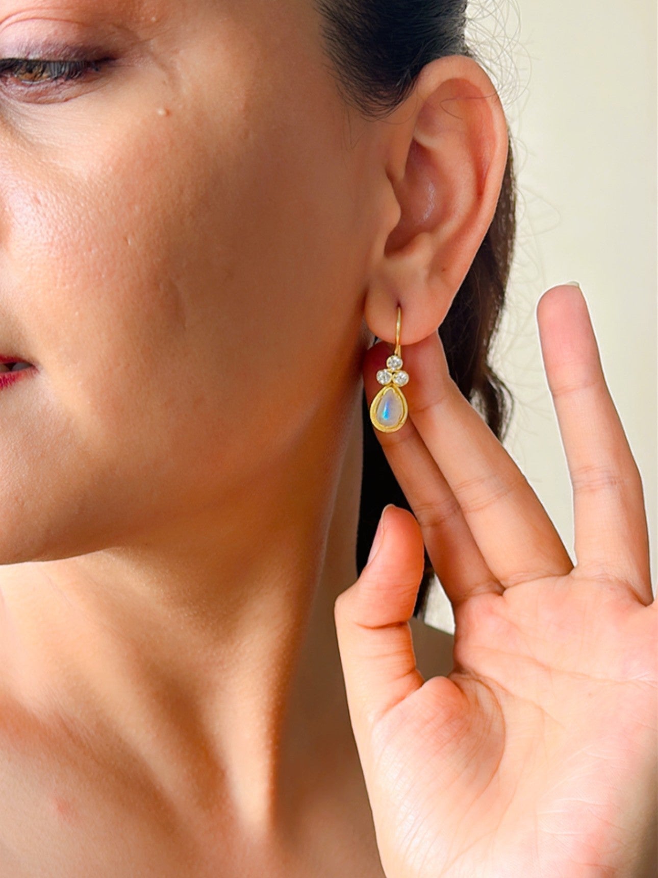 The Dewani Drops combine a tear drop moonstone gemstone with a floral top adorned by sparkling stones, embodying graceful and timeless charm. Crafted from 925 silver with gold plating, these earrings offer an elegant fusion of subtle brilliance and classic design.