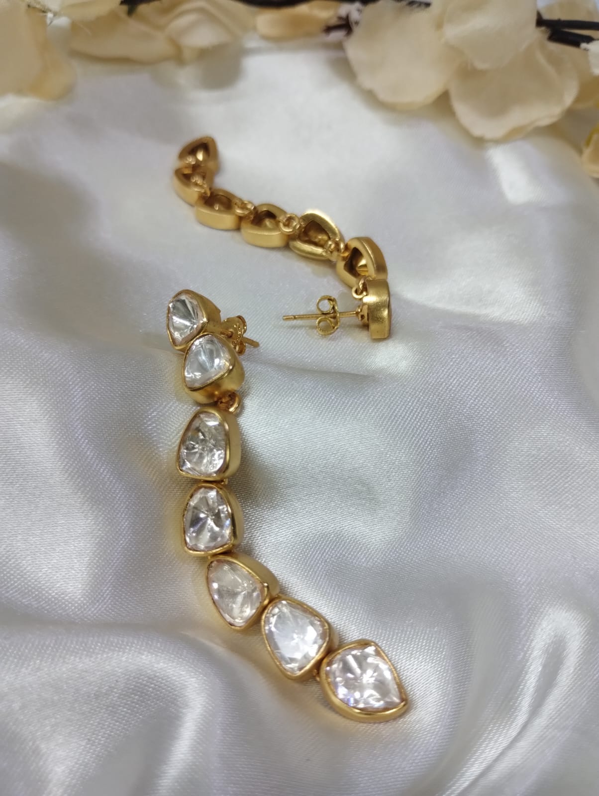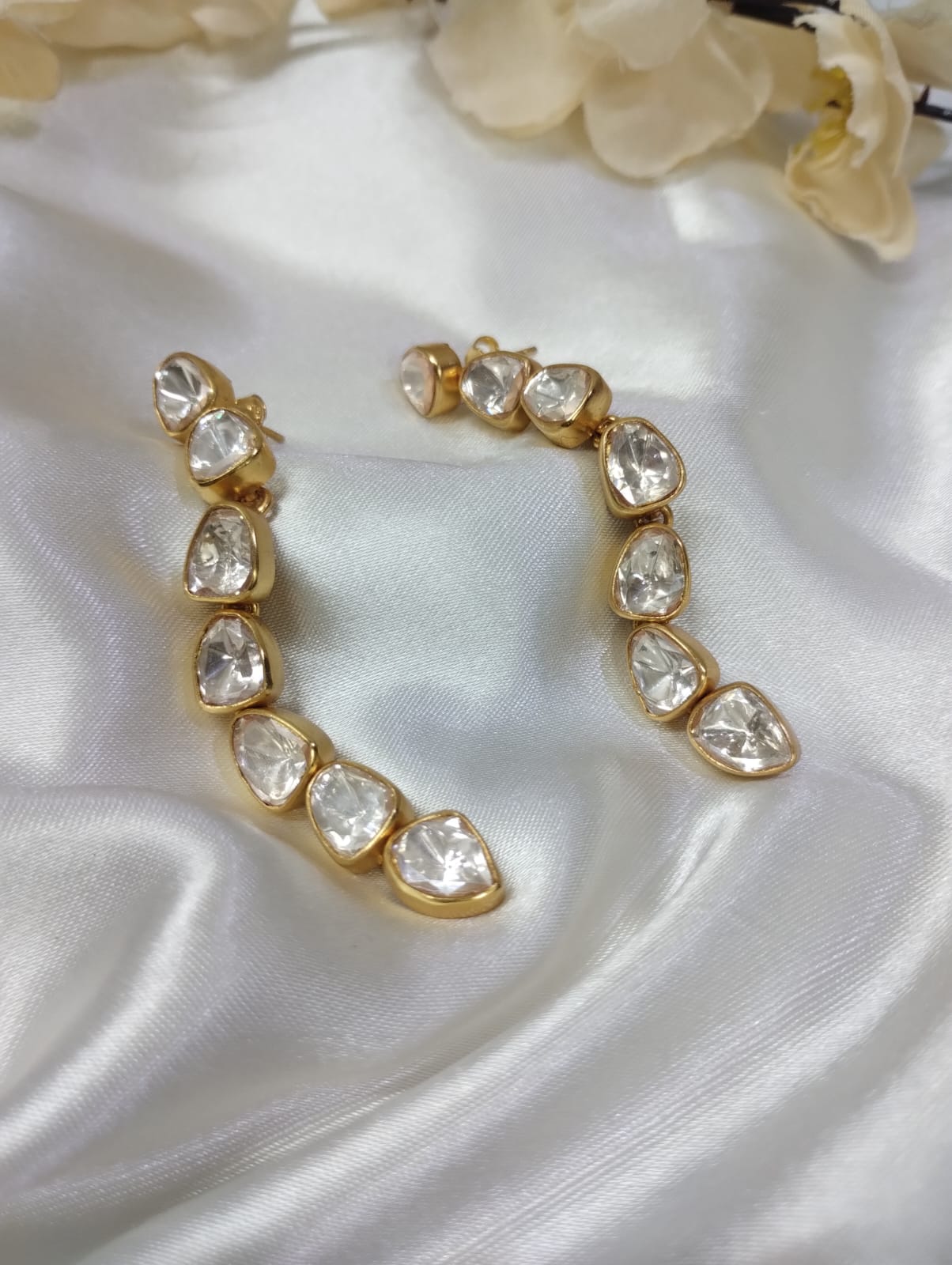 Expertly crafted in 925 Silver with Gold plating, the Kamya Earrings feature stunning long, straight design and are studded with brilliant Moissanite Polki stones.
