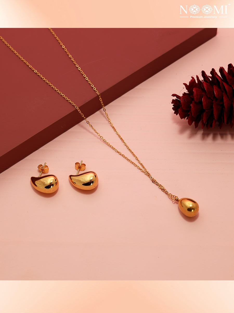Crafted from stainless steel and finished with gold plating, the LumiDew Pendant Set features a unique dew drop shape. Its anti-tarnish and waterproof properties make it a durable and long-lasting accessory.