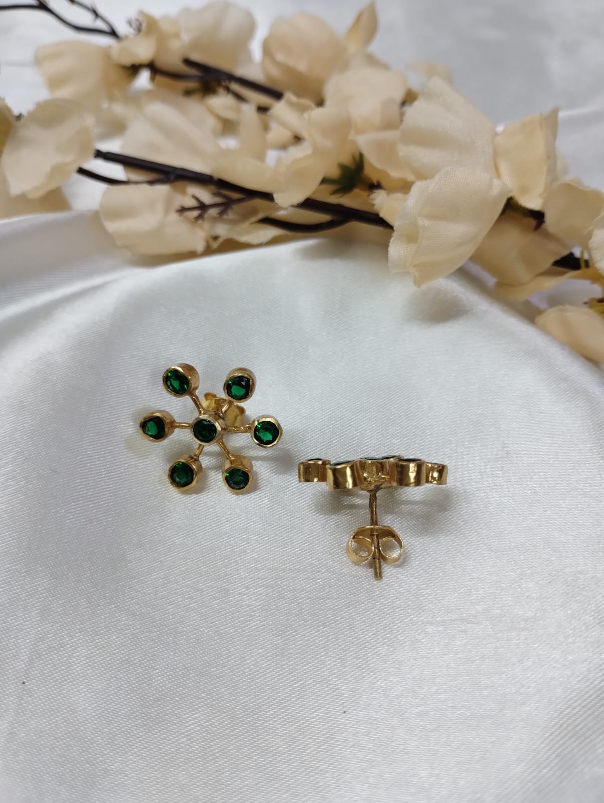 These exquisite earrings feature seven round emerald-colored stones set in a sleek 925 silver base with elegant gold plating. The vibrant stones are arranged in a graceful pattern, creating a striking visual effect that captures light and attention.