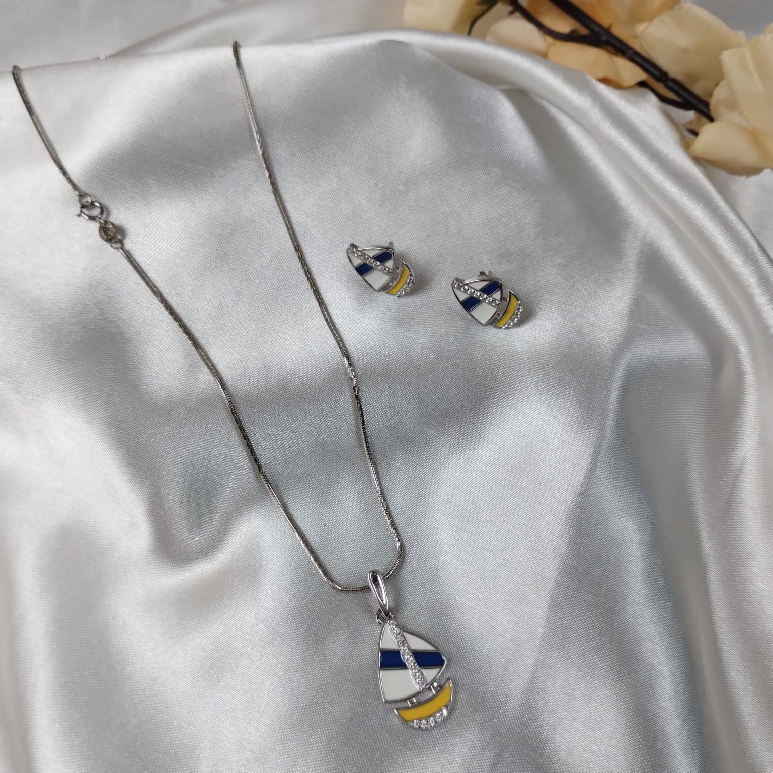 Embrace your free-spirited nature with this stunning bohemian-themed white, blue, and yellow sloop pendant set. The delicate pendant with matching earrings will add a chic touch to any outfit while conveying a sense of adventure.