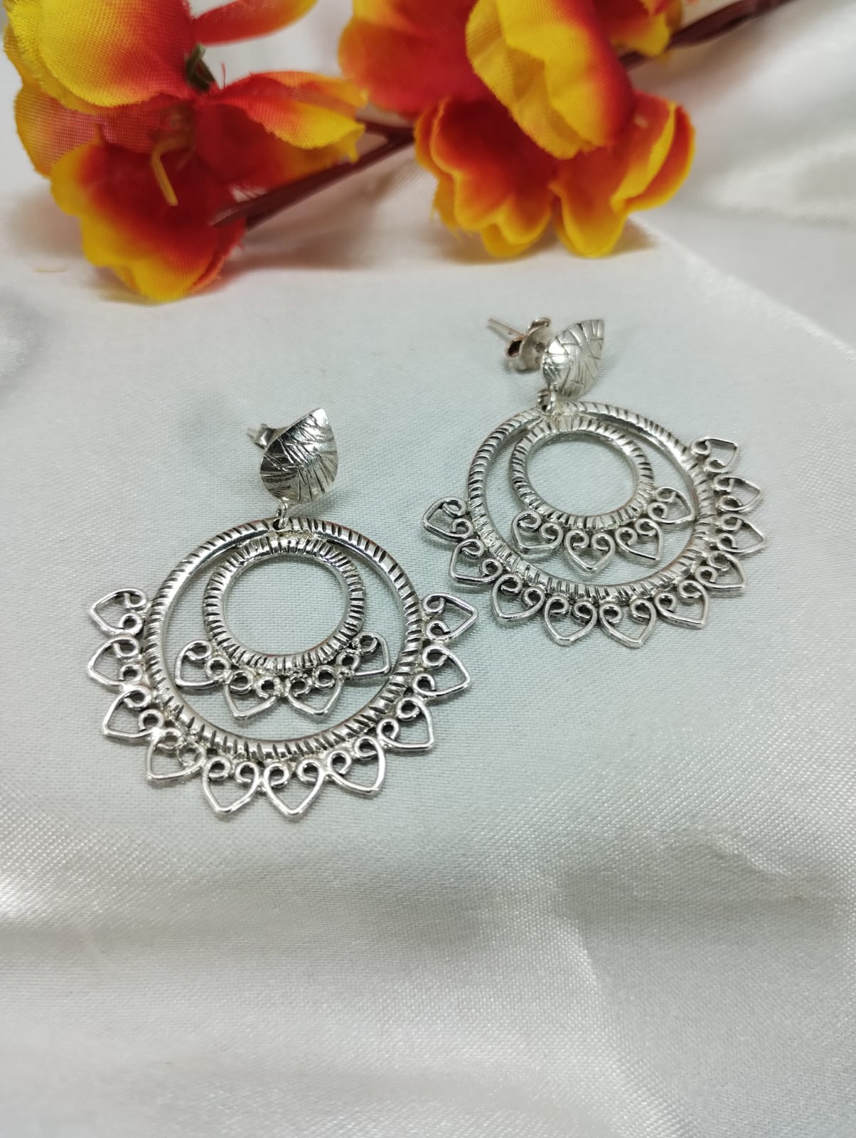 The Meher Chakra Earrings are expertly crafted in 925 silver, showcasing heart-shaped motifs intertwined with a classic circular design. These chaand bali earrings combine aesthetic charm and symbolic elegance, making them an ideal accessory for everyday wear with a touch of sophistication.