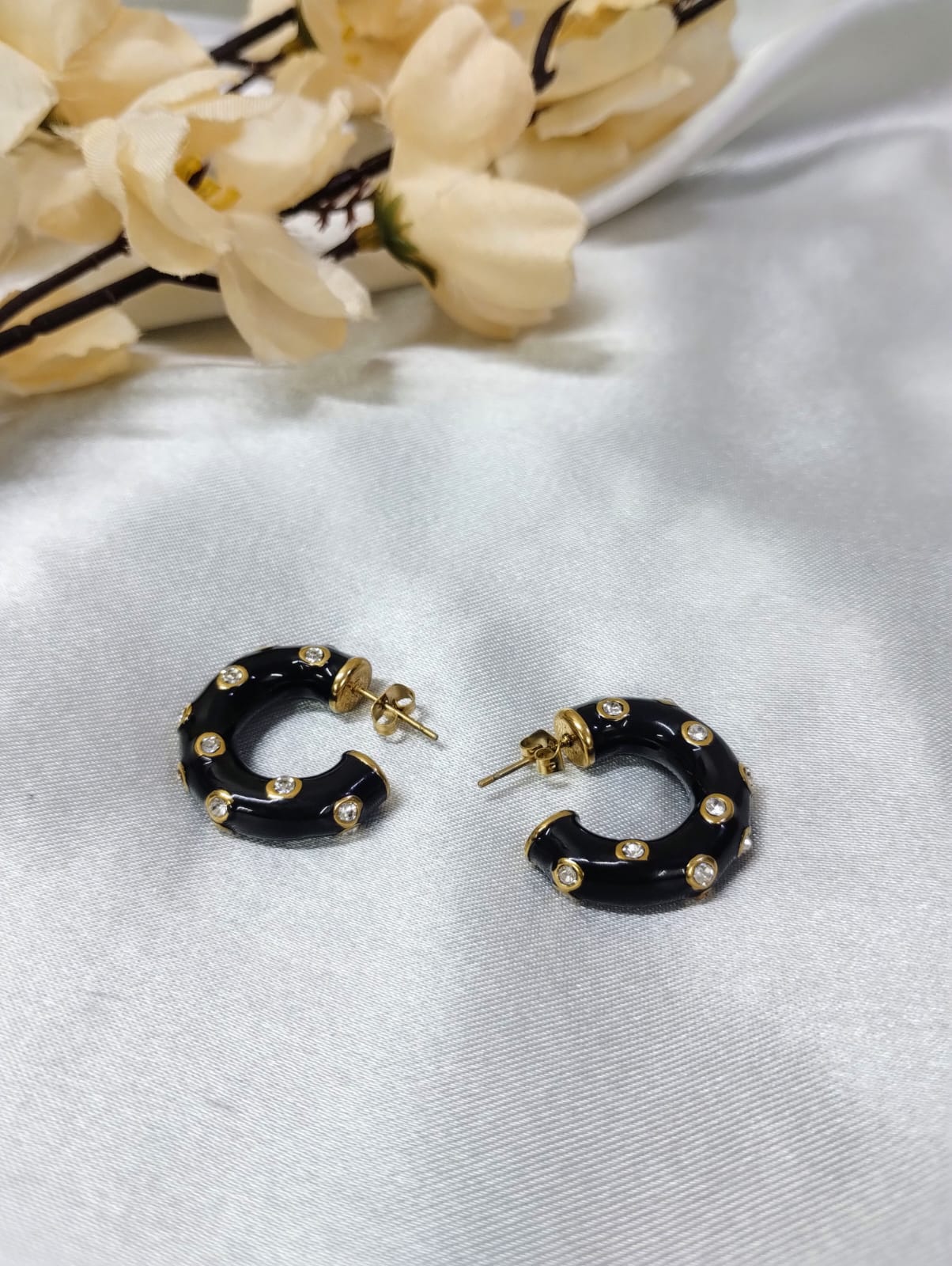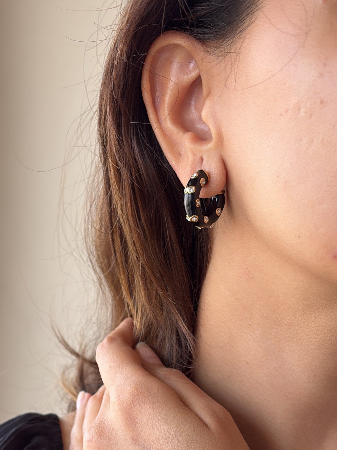 Our Midnight Hoop Earrings are expertly crafted with stainless steel and gold plating, making them waterproof, anti-tarnish, and hypoallergenic for all-day wear. With sparkling crystals and black enamel work, these earrings add a touch of elegance to any outfit.