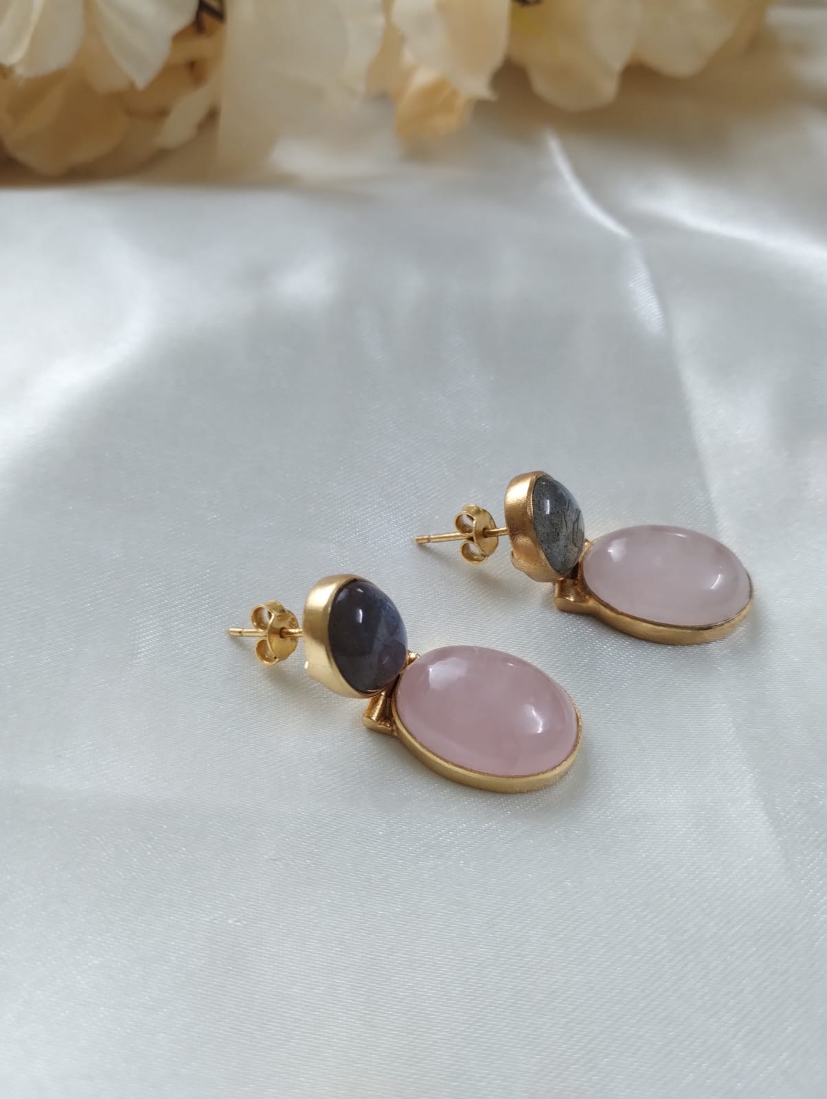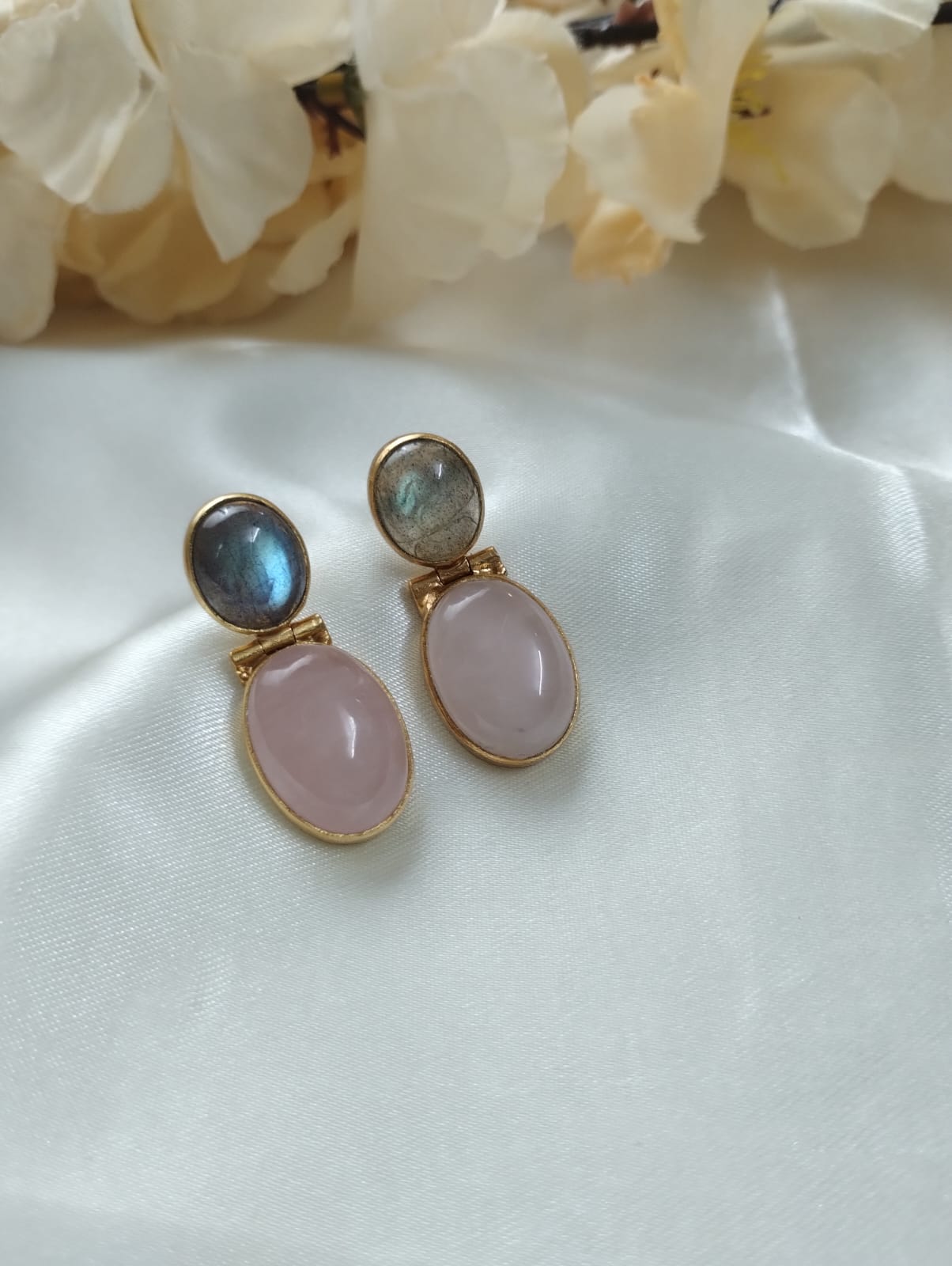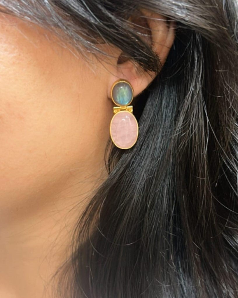 Indulge in timeless elegance with Mihika Earrings. Handmade in 925 sterling silver and accented with a touch of gold plating, these earrings showcase the natural beauty of rose quartz and labradorite stones.