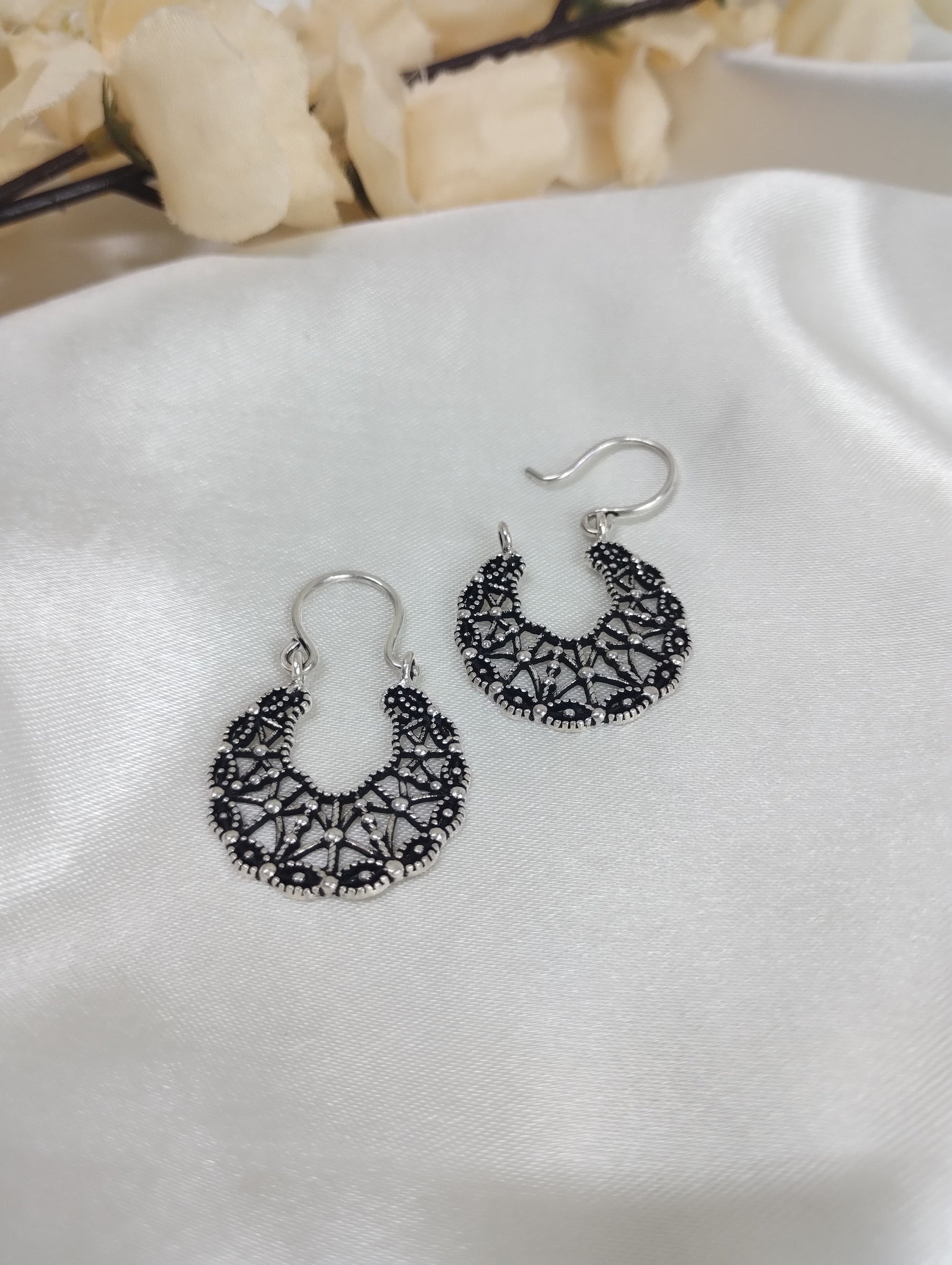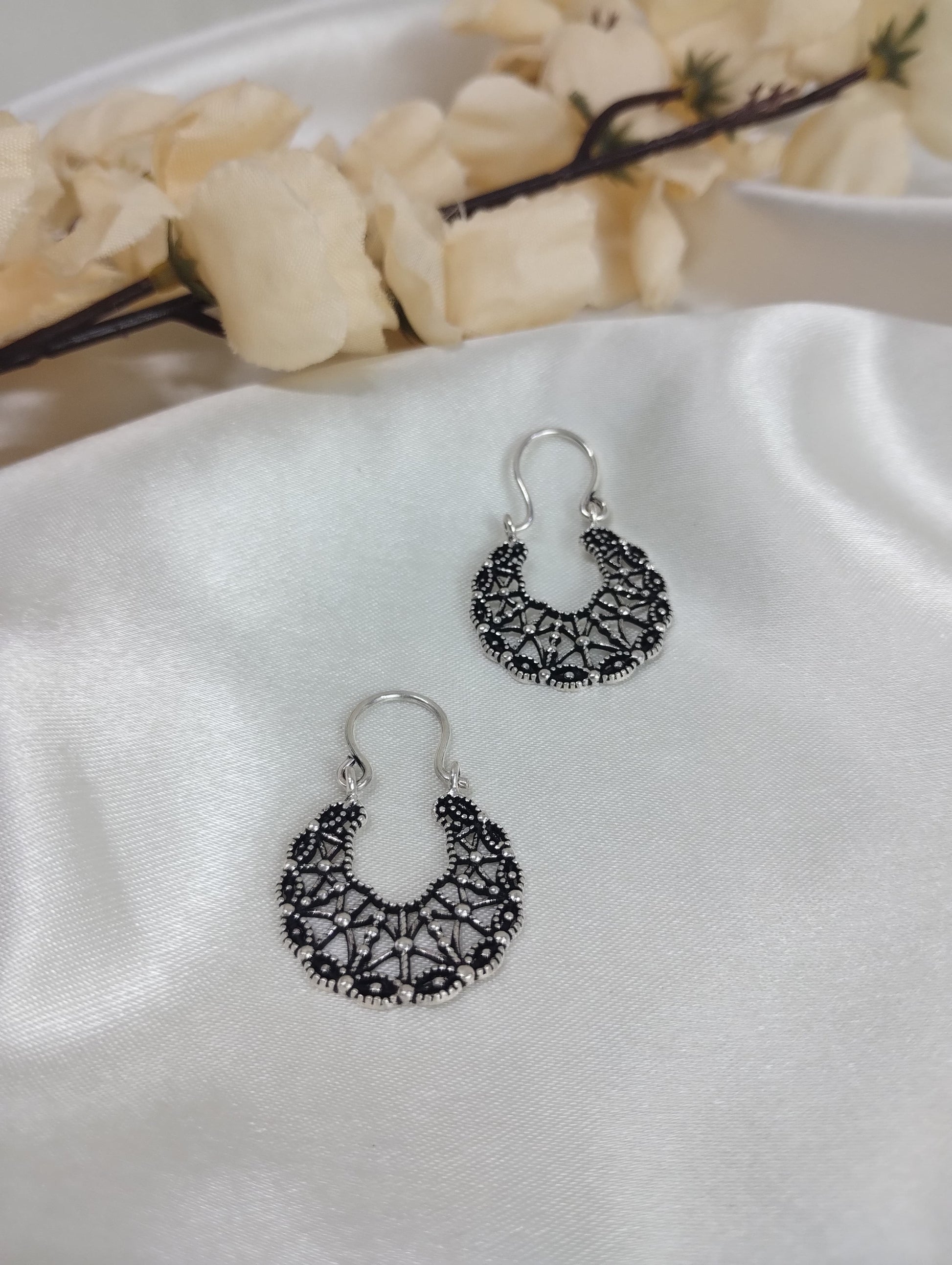 Expertly crafted with 925 silver and a unique oxidized finish, these Nisha Balis adds an elegant touch to any outfit. The intricate design showcases expert craftsmanship and makes for a stunning statement piece.