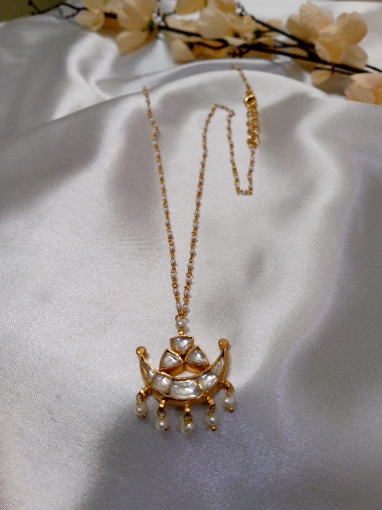 Exude timeless elegance with our Noor Pendant Chain. Crafted from 925 silver with gold plating, this pendant features a beautiful moissanite polki stone and is paired with a delicate pearl chain.