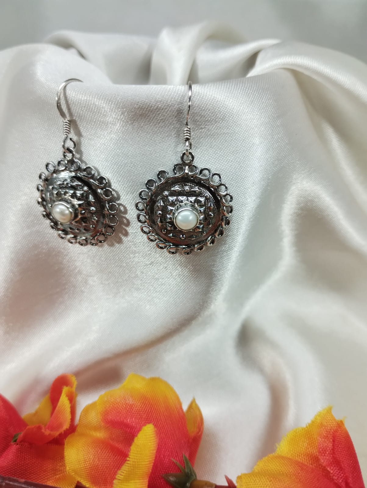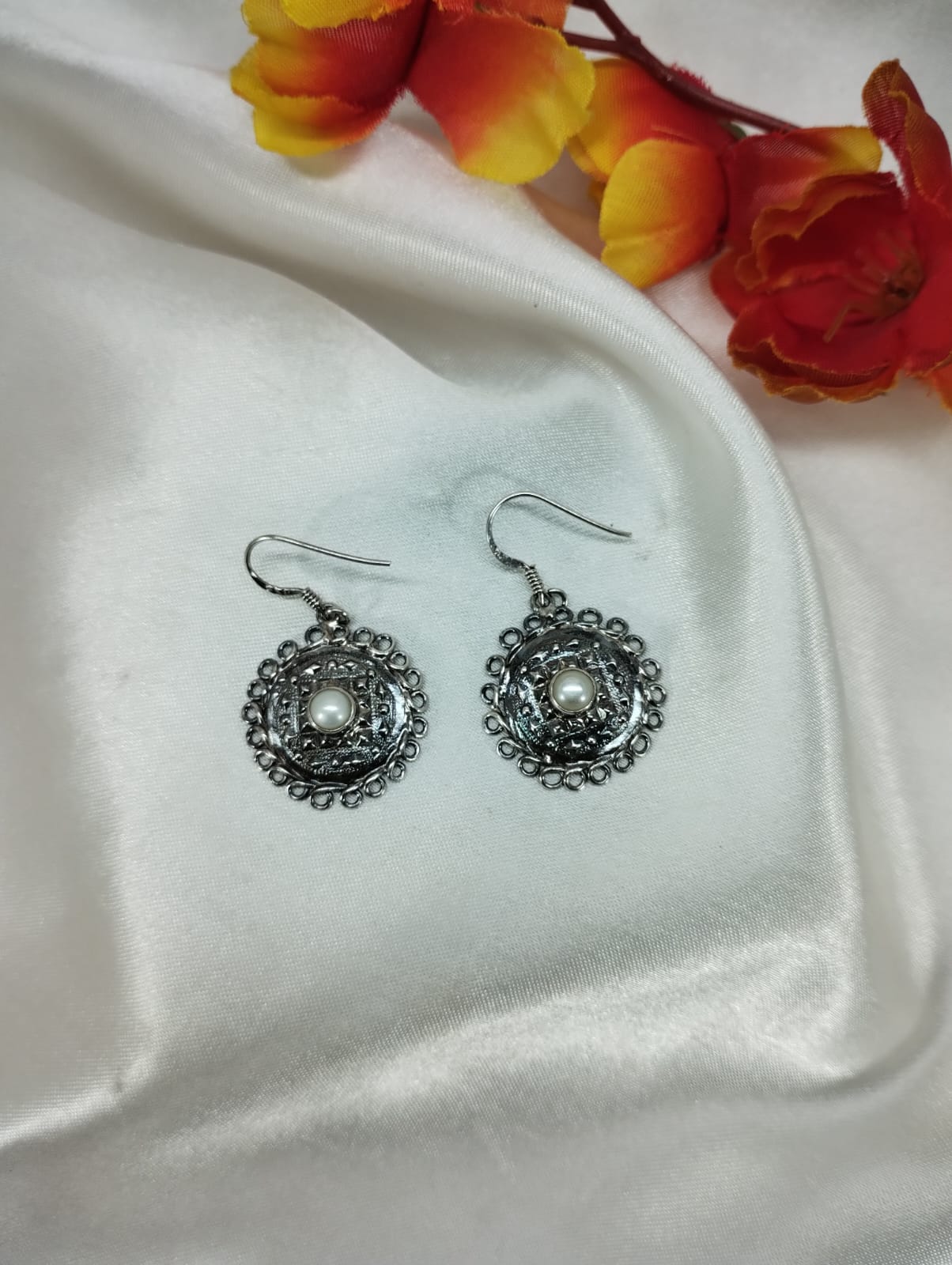 Crafted from 925 sterling silver, the Noorika Earrings feature an ornate oxidized finish that highlights their intricate patterns. At the center, a lustrous pearl adds a touch of elegance, combining traditional design with refined craftsmanship.