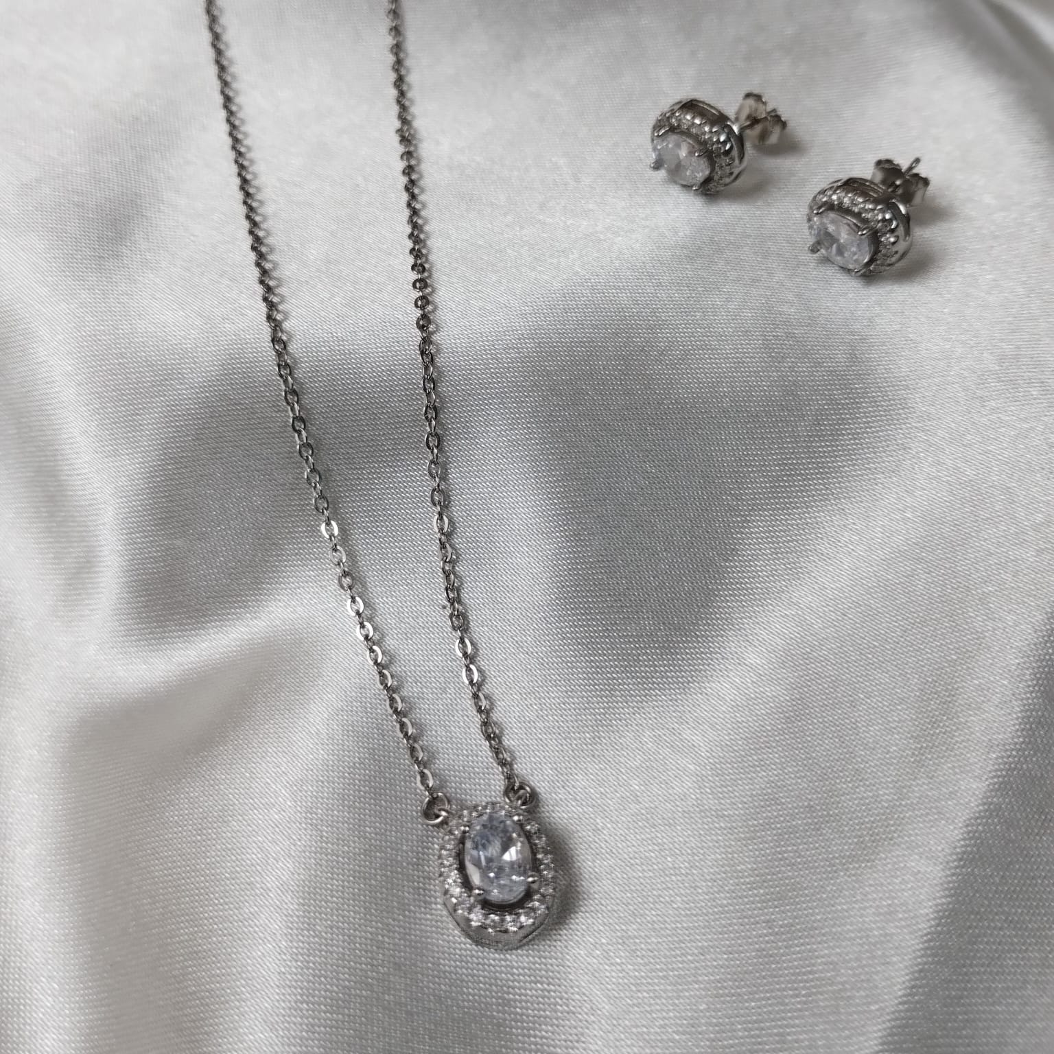 The Eternal Radiance Oval Pendant is expertly crafted with a classic oval solitaire zircon set in high-quality 925 silver. The pendant comes with a matching set of stud earrings for a complete look. Add a touch of elegance to any outfit with this timeless and sophisticated jewelry set.