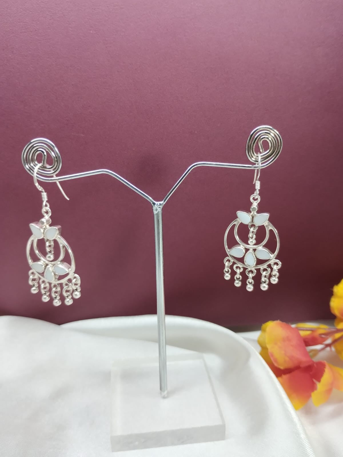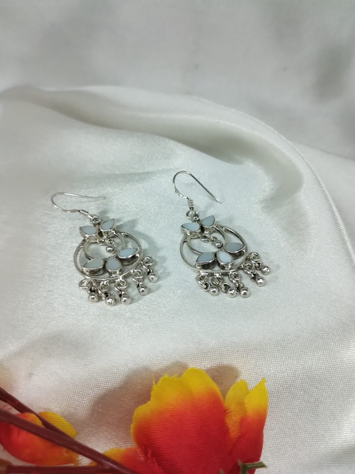 Crafted from authentic 925 silver, the Pearl-leaf Chand Bali showcases a circular frame embellished with elegant leaf-shaped mother of pearl accents. Delicate silver ghungroo-style danglers add subtle movement and a traditional touch, making this piece a refined blend of artistry and heritage ideal for sophisticated occasions.