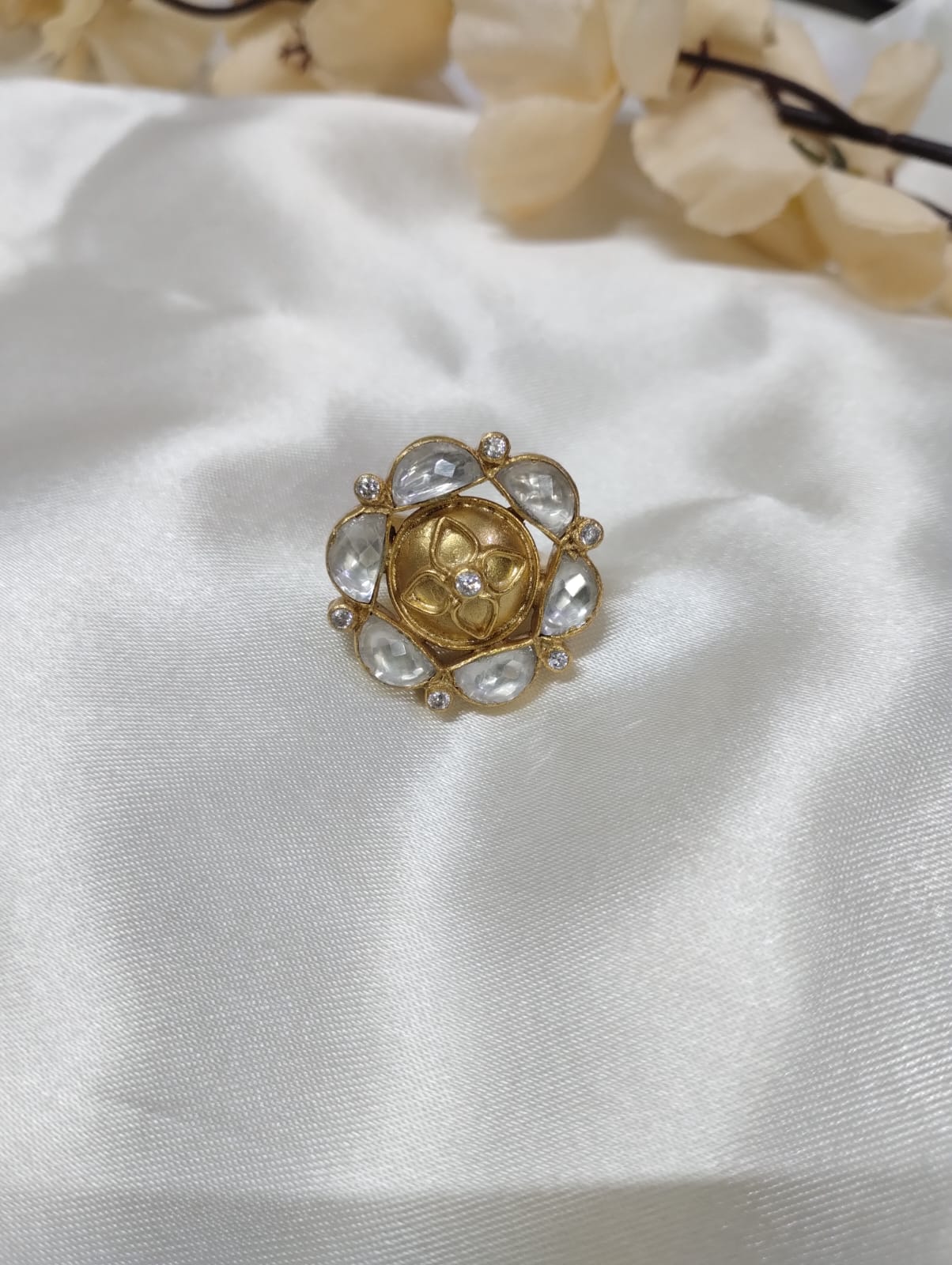 The Rajika Ring is expertly handcrafted in 925 silver and accented with gold plating. Its stunning design features a dazzling array of zircon stones, making it a true statement piece.