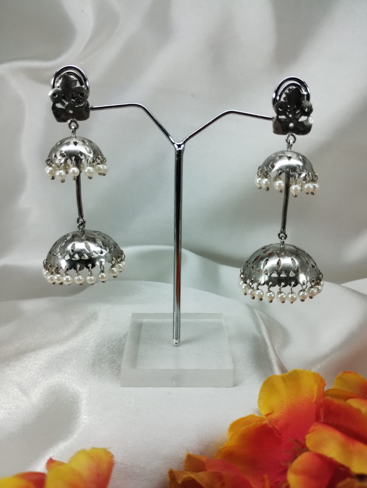 Crafted from genuine 925 silver, the Rajsi Jhumka features a classic double jhumka design accentuated by delicate pearl drops and detailed floral motifs. This elegant piece showcases refined artistry, blending traditional aesthetics with subtle sophistication for a timeless accessory.