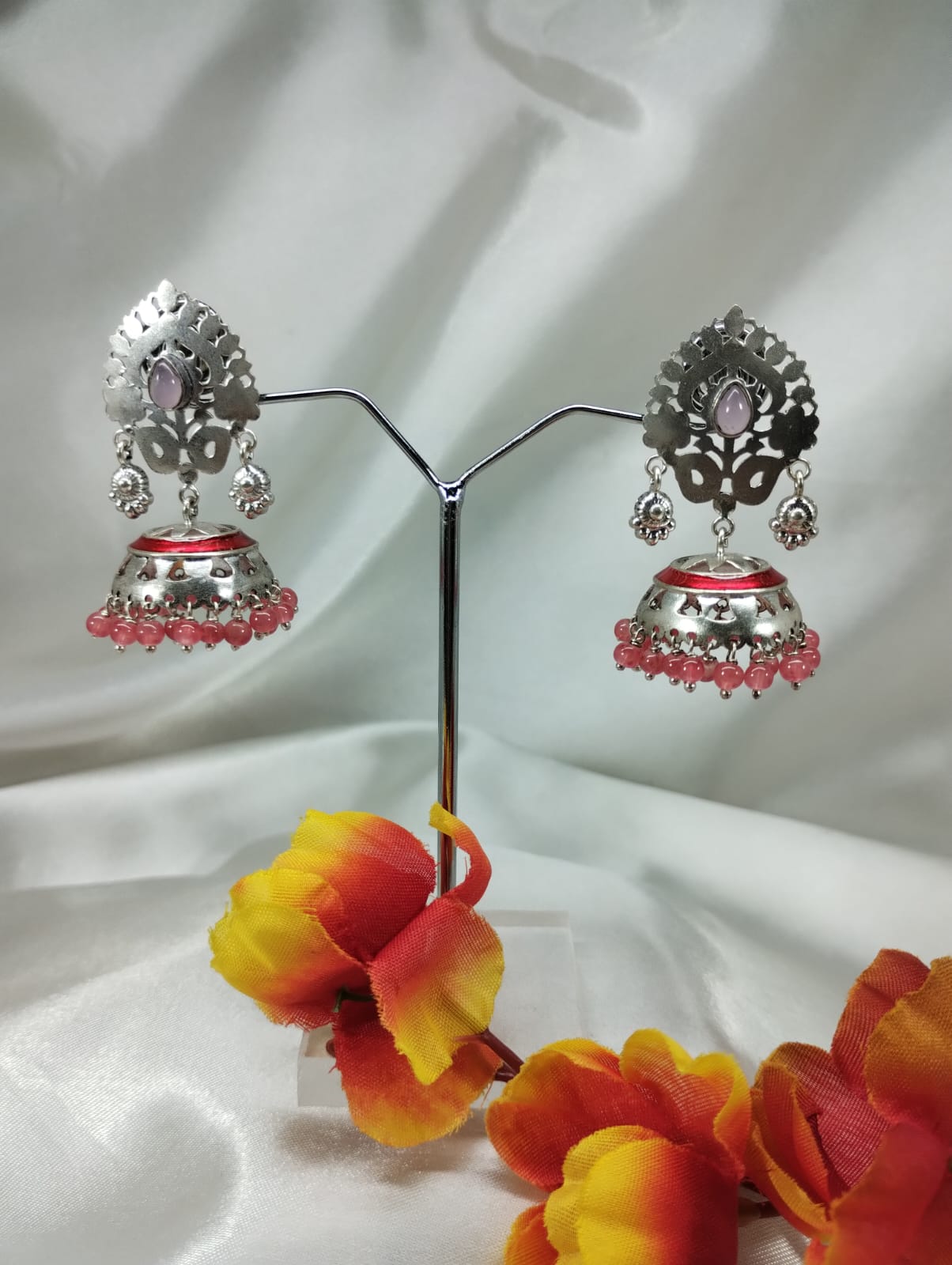 Crafted from authentic 925 silver, the Rangjhum Earrings combine rich silver tones with vibrant red enamel and delicate pink beads. This jhumki design seamlessly balances traditional charm with lively color accents, making it an essential piece for those who appreciate expert craftsmanship and timeless elegance.