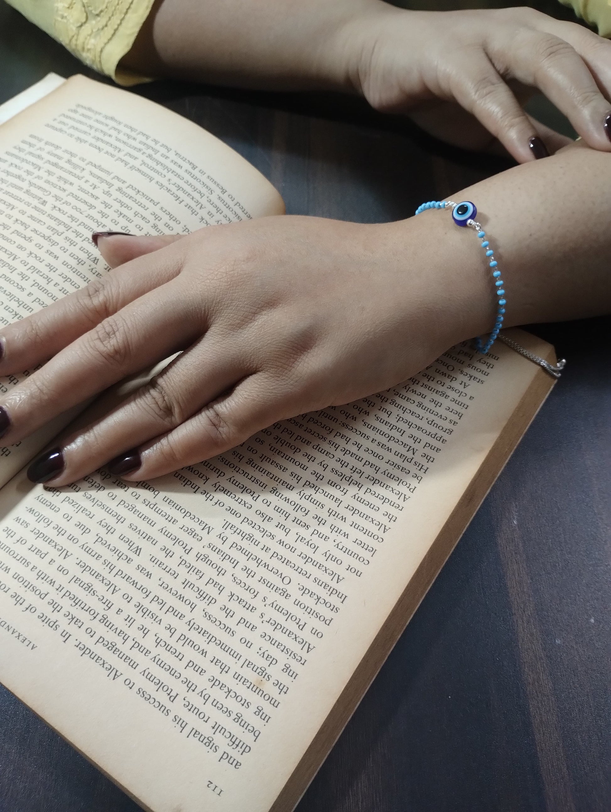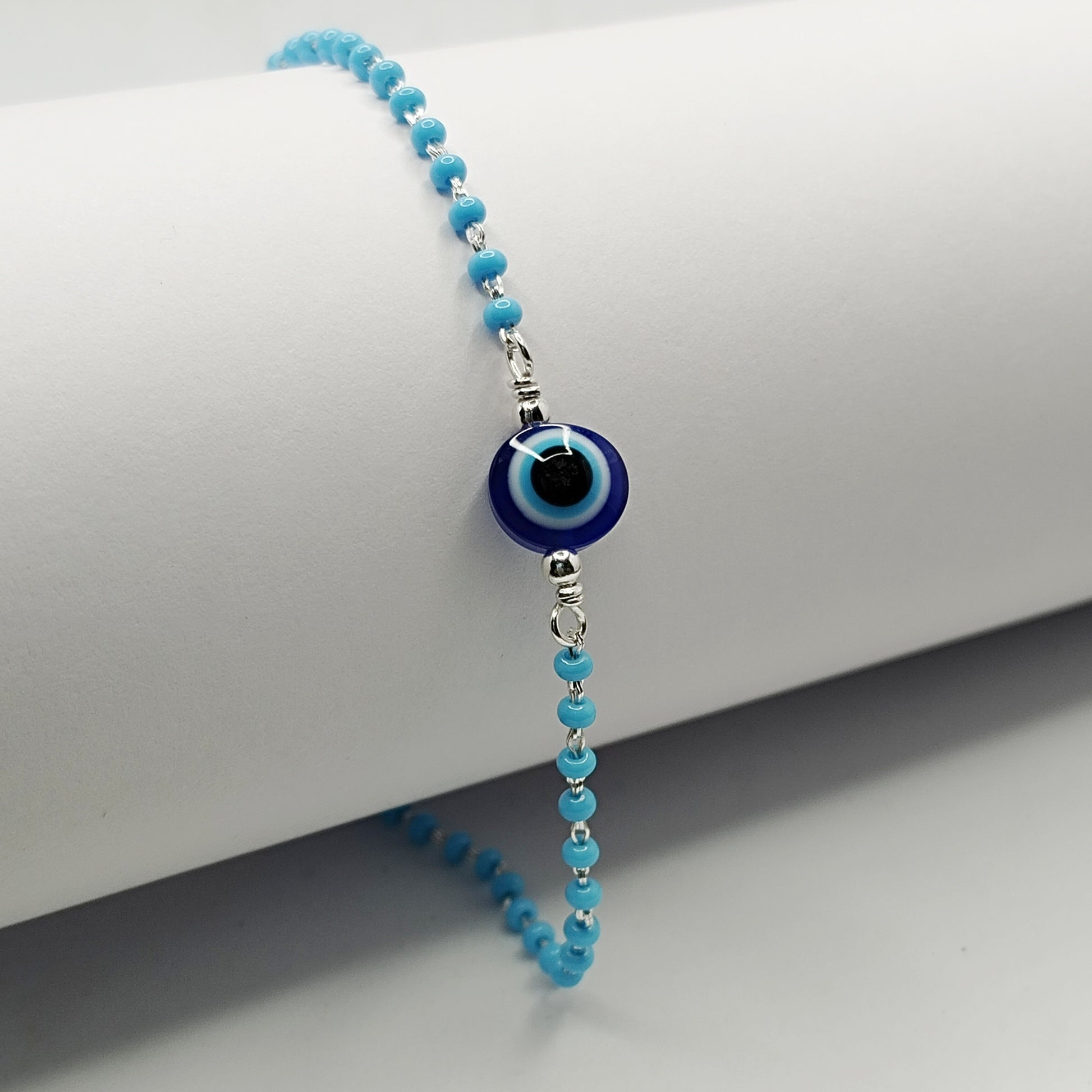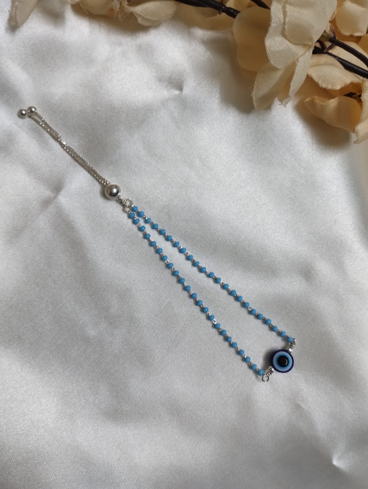 This adjustable evil eye bracelet is crafted from durable silver and accented with beautiful serene sky blue beads. Symbolizing protection and good luck, the evil eye charm is intricately designed to ward off any negative energies.