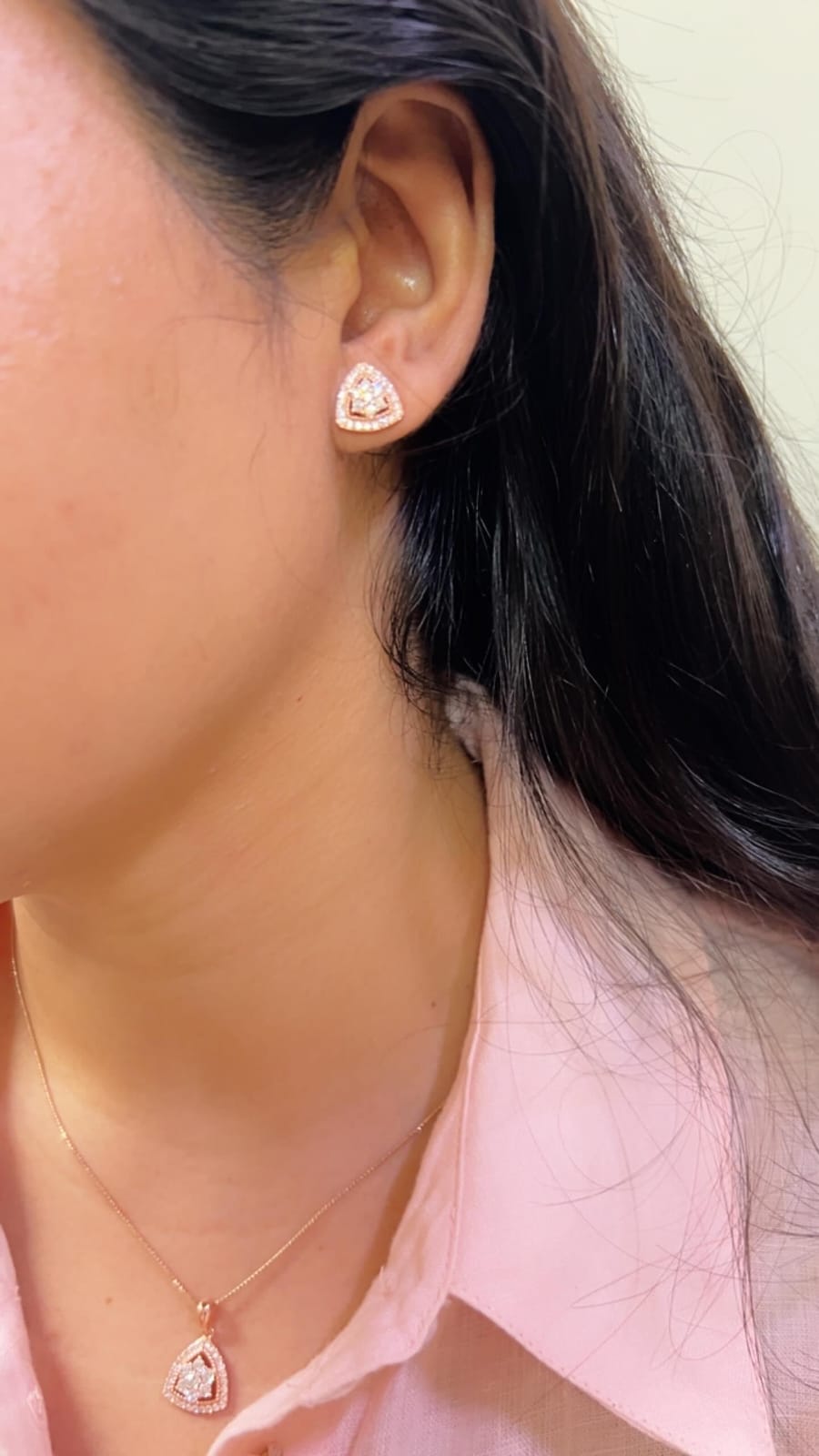 This Trinity Silver Pendant Set features a stunning 925 silver pendant in a unique triangle shape, complemented by a rose gold plating. Its intricate design and elegant color contrast make it a versatile and timeless accessory for any occasion.