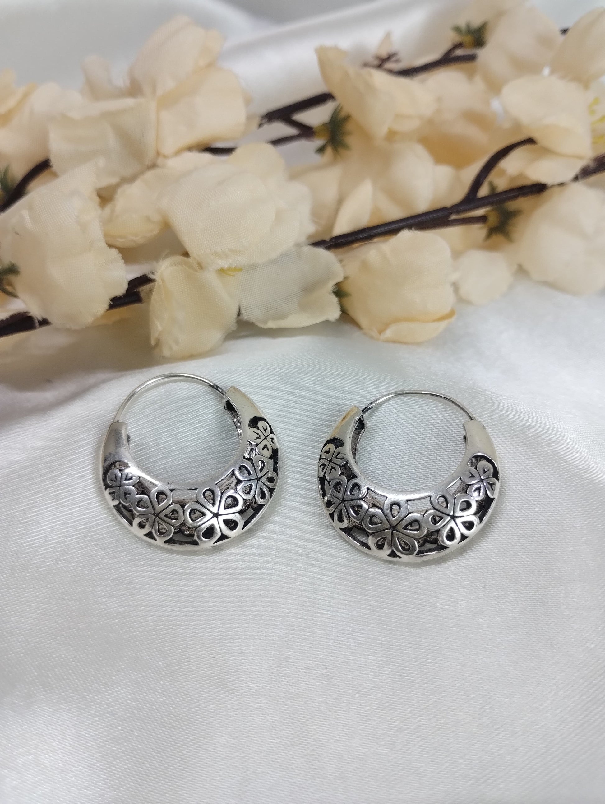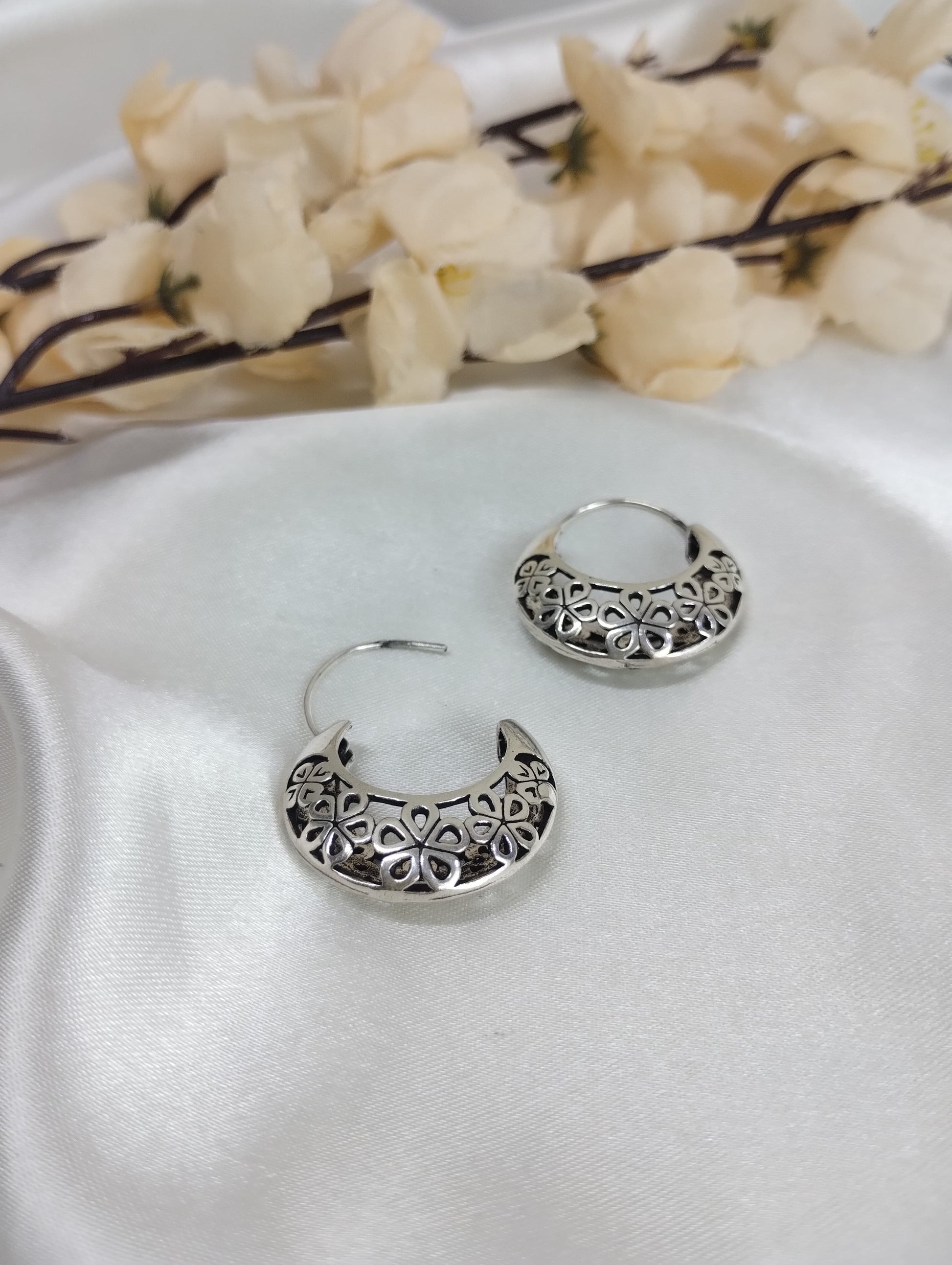 Made from 925 silver, these oxidized hoops feature intricate flower designs for a unique touch.