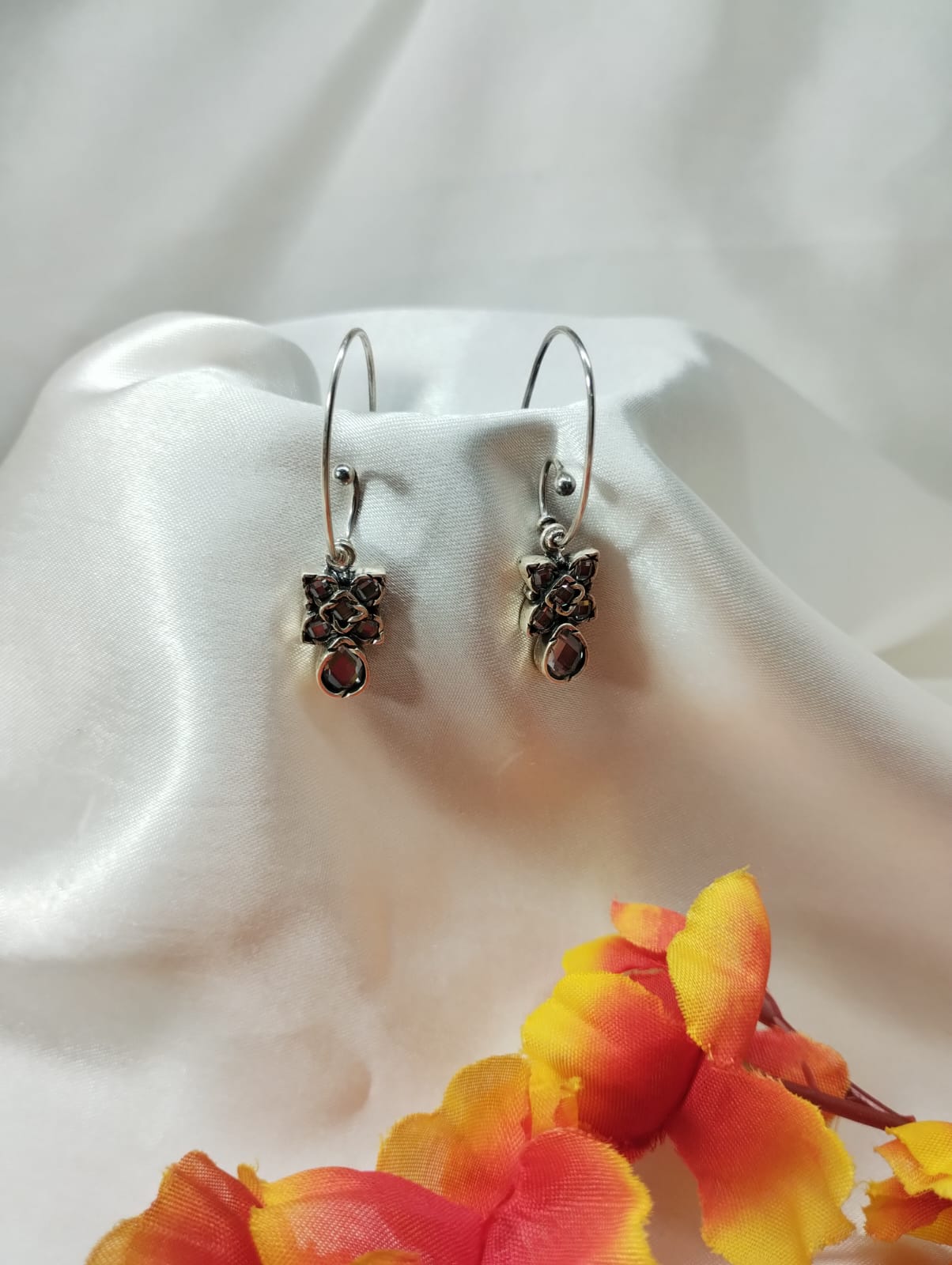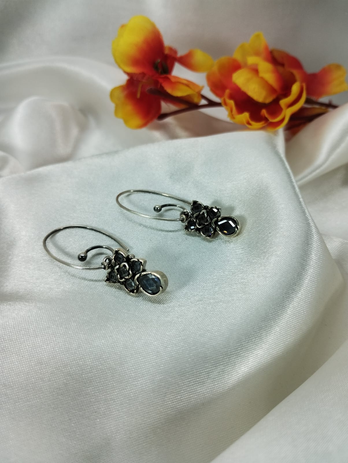 The Zarika Earrings are expertly crafted from 925 sterling silver, featuring a delicate floral motif paired with teardrop-shaped zircon stones. Their oxidized finish adds depth and a subtle vintage appeal, making them a refined accessory that balances timeless elegance with intricate design.